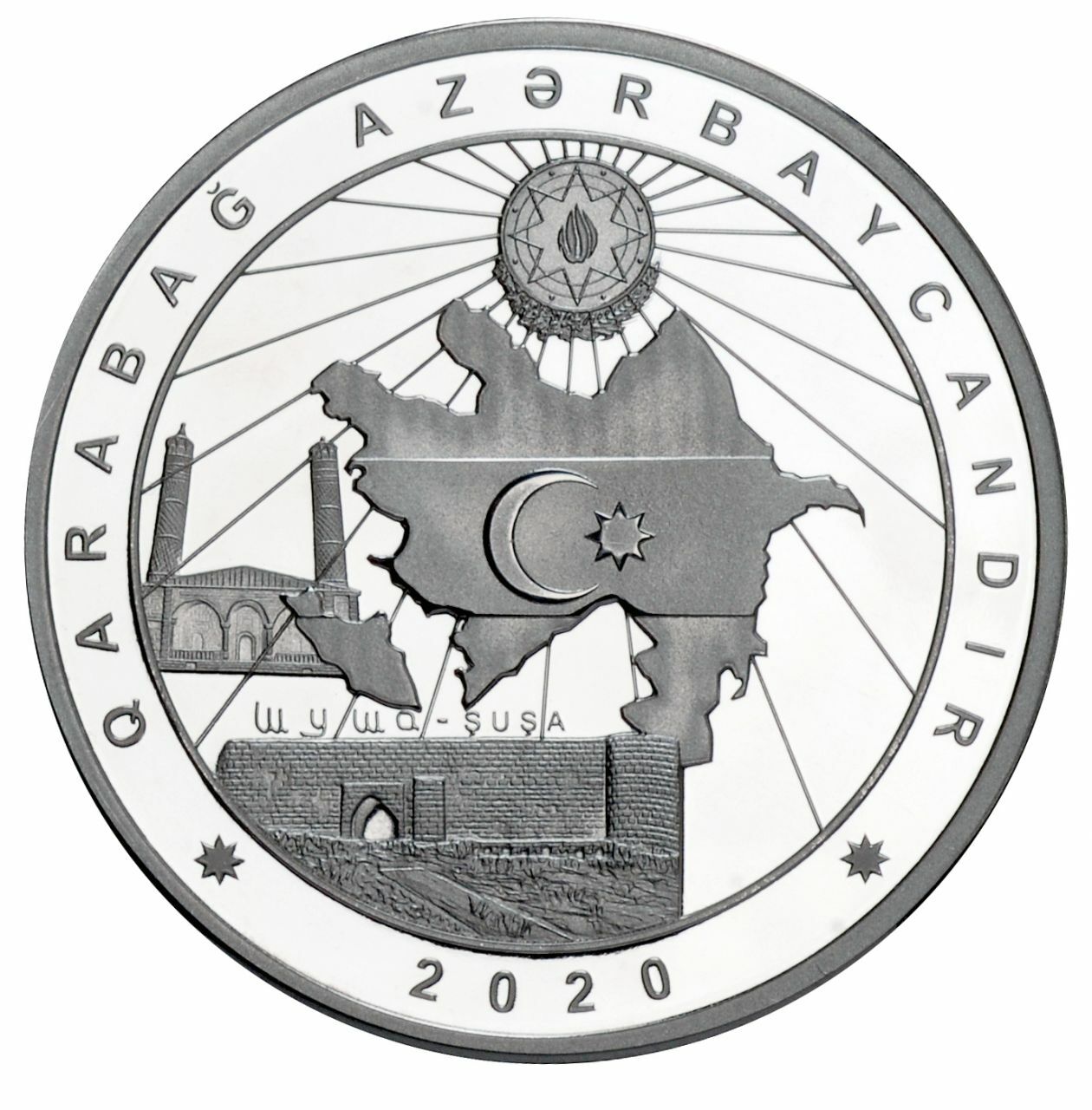 Годом чеканки монеты указан 2020 год, хотя информация о монете появилась на сайте монетного двора Турции только во второй половине января 2021 года. На лицевой стороне монеты отчеканены контур Азербайджана с гербом страны, изображение крепости Шуша и мечети Юхары Гевхер. По канту на азербайджанском отчеканена фраза: «Карабах – это Азербайджан». На оборотной стороне монеты отчеканен эндемик Кавказа - офрис кавказская – цветок семейства орхидных, считающийся символом Шуши.
