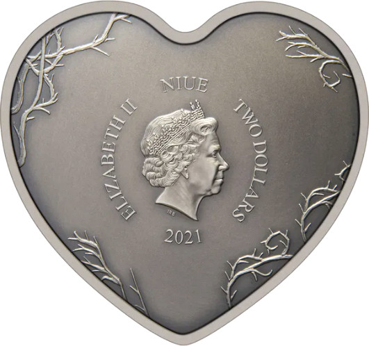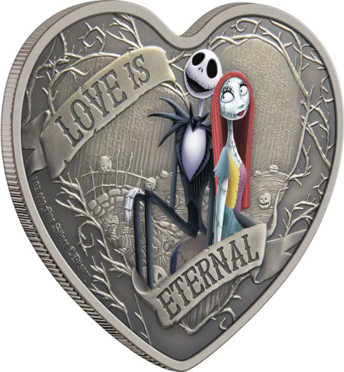 На лицевой стороне монеты из серебра 999 пробы номиналом 2 доллара отчеканен портрет королевы Великобритании Елизаветы II. На оборотной стороне изображены в цвете персонажи культового мультипликационного мюзикла Тима Бертона «Кошмар перед Рождеством» Джек Скеллингтон и Салли, окруженные мрачными деталями (черепами, тыквами, ветвями деревьев) и надписью «Любовь вечна» (Love is eternal). Монета упакована в подарочную упаковку – книгу.